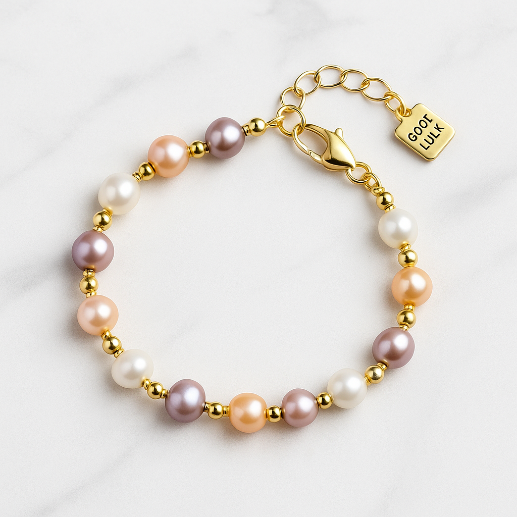 • The Good Luck Bracelet – 18K Gold Plated Natural Pearl beads with a charm blessed for protection and prosperity.